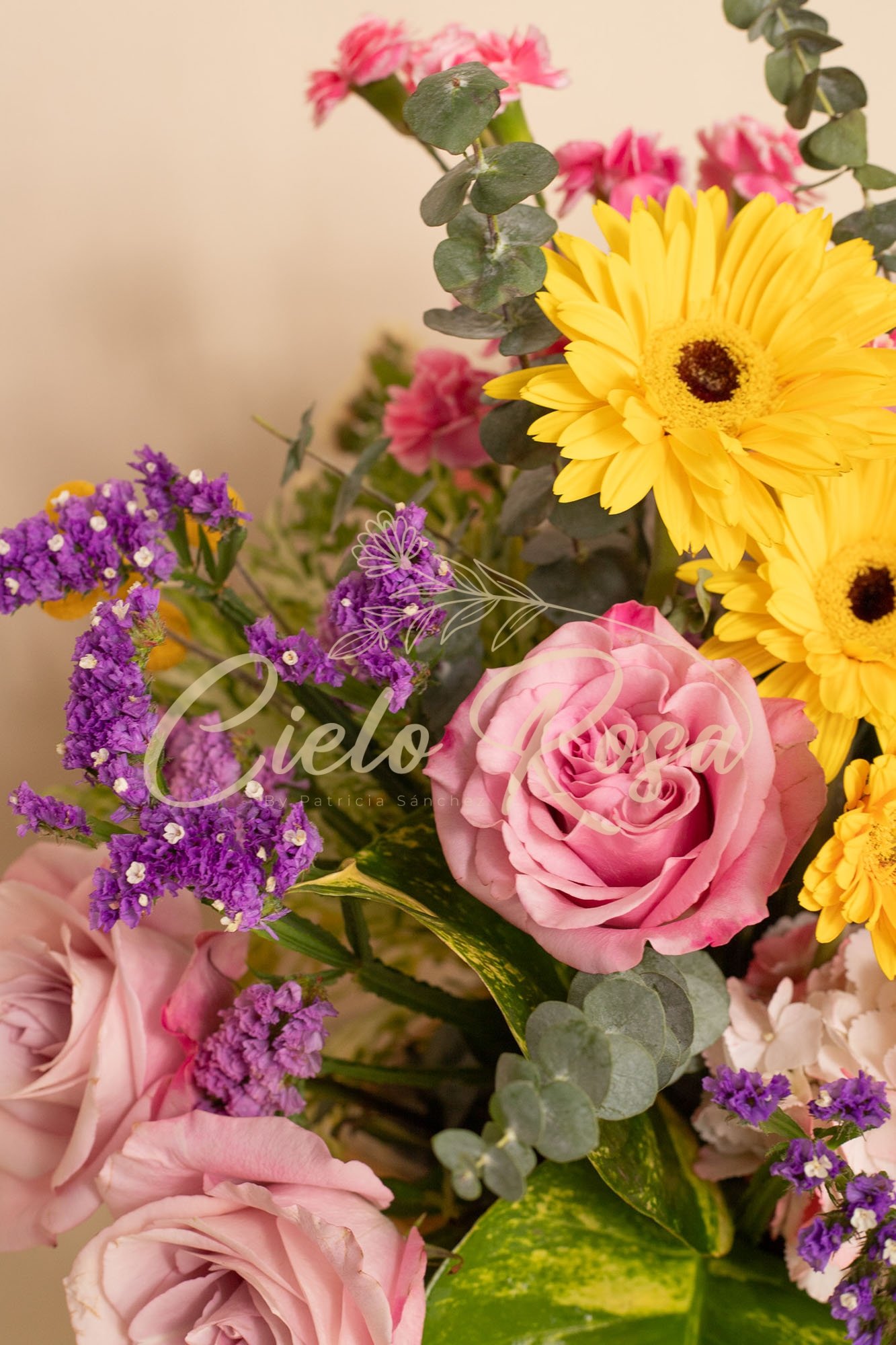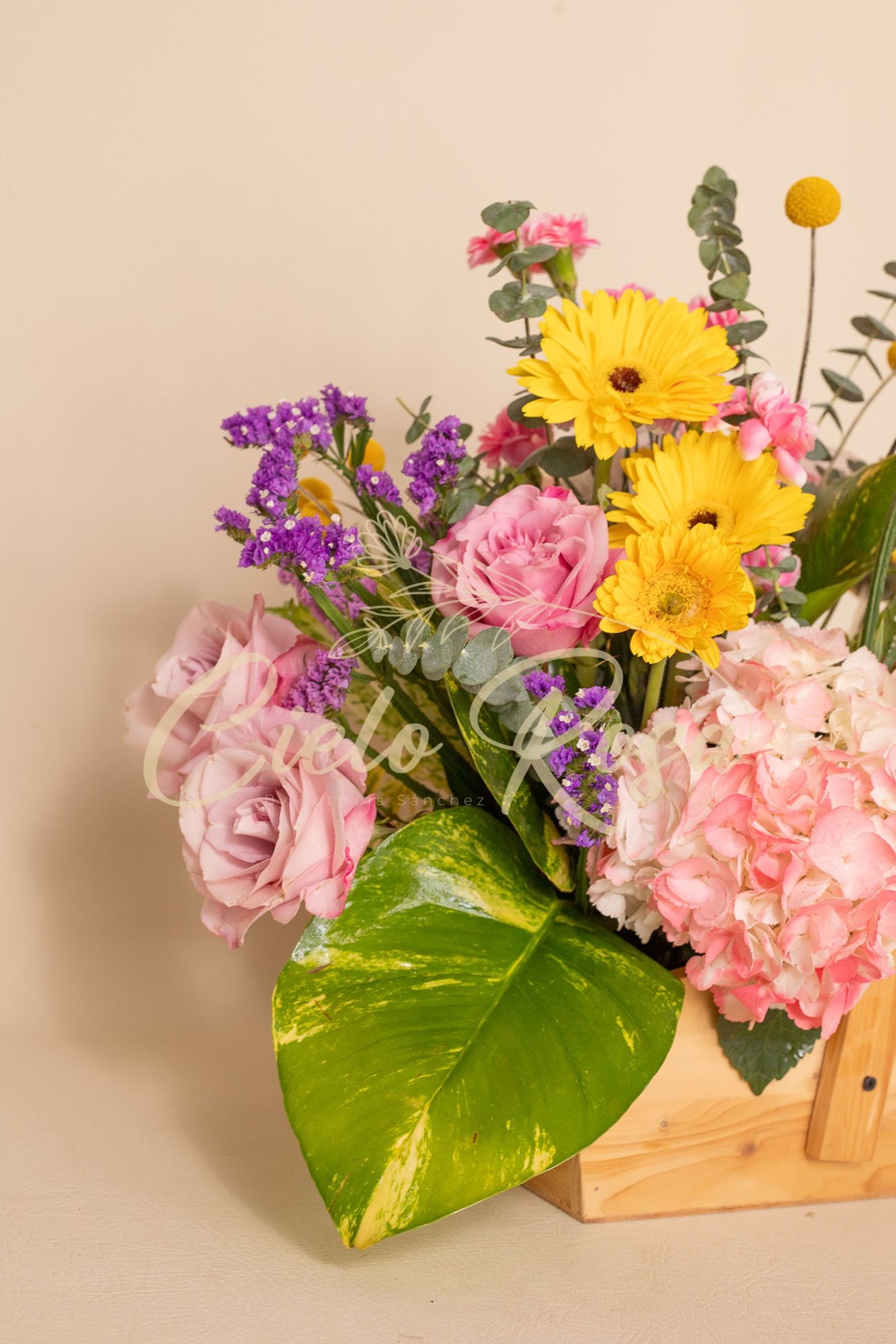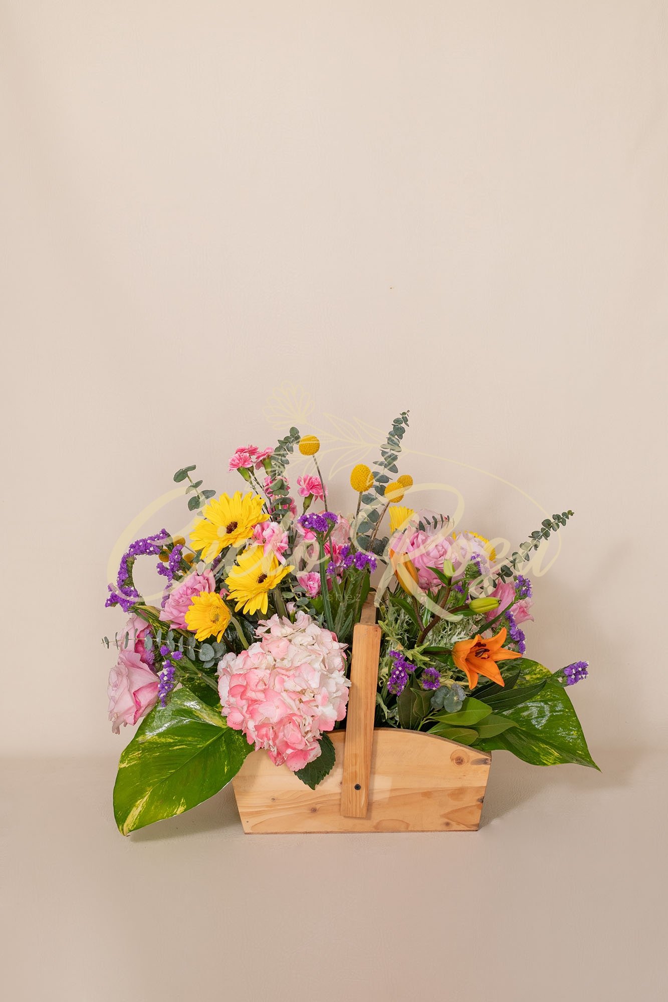 Canasta de madera con hortensias surtidas, lirios, rosas, gerbera y follajes surtido