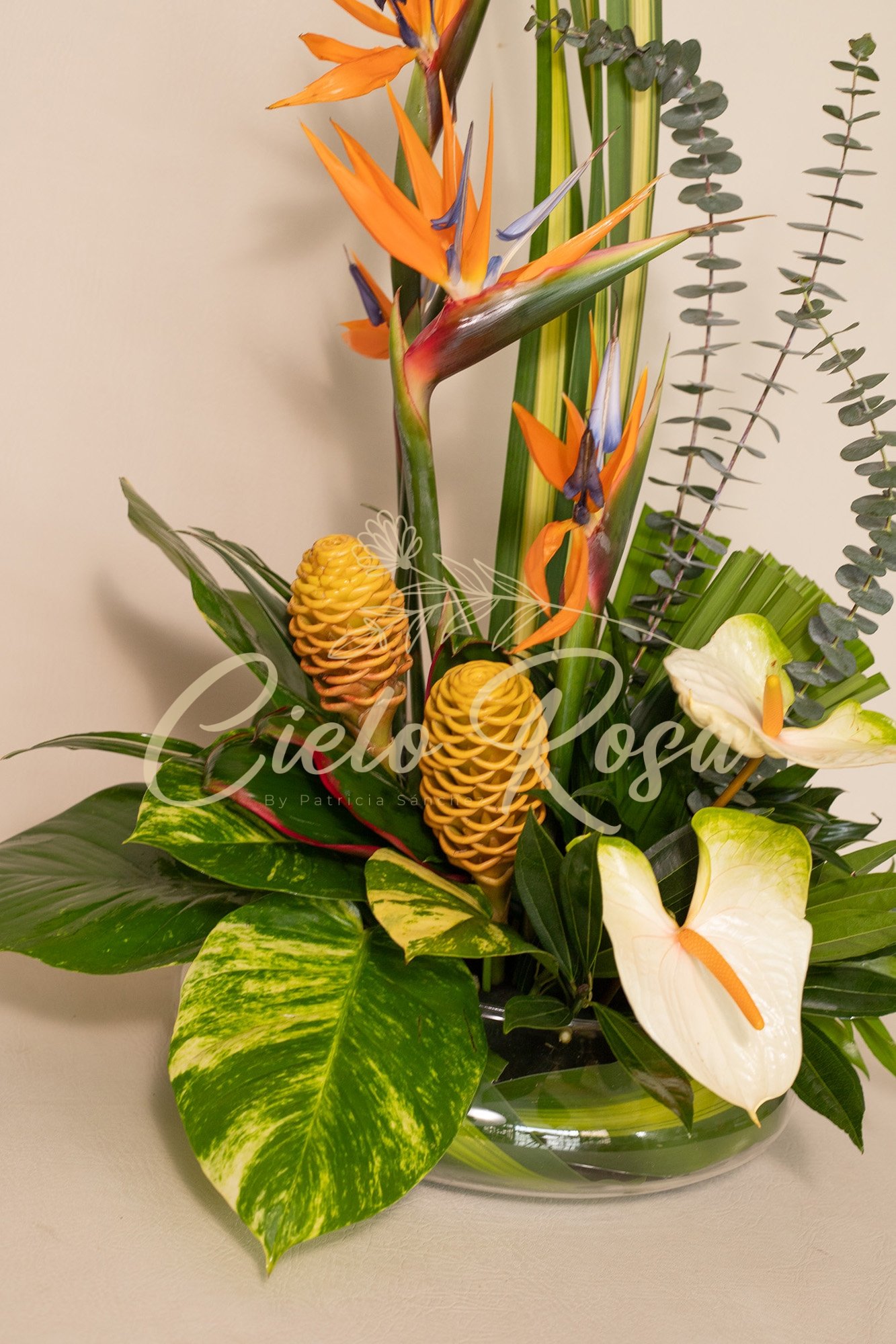 Base acuario de vidrio, anturios, maracas, aves del paraíso y follaje