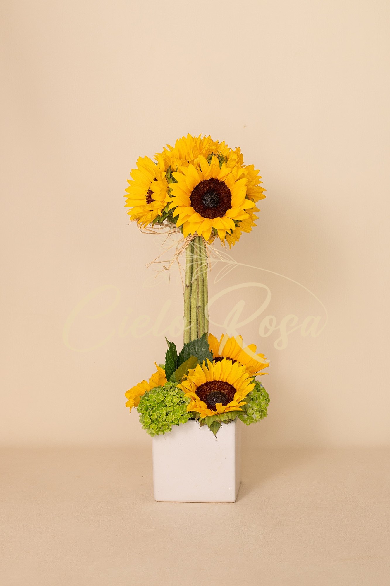 Caja de madera blanca, girasoles, hortencias verdes y variedad en follaje