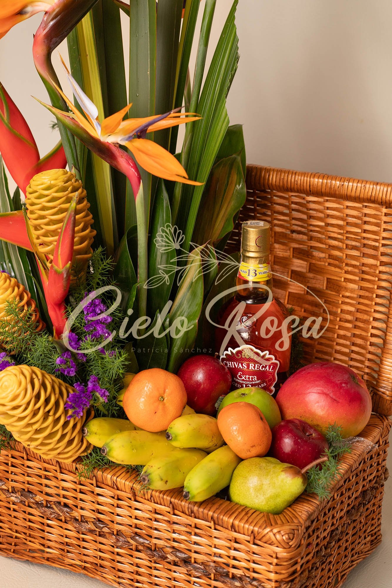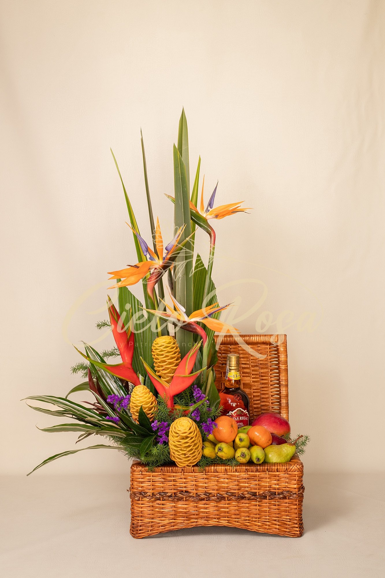 Flores Exóticas, Maracas, Aves del Paraíso, Éxtasis, Follaje Frutas de Temporada y Botella de Wisky