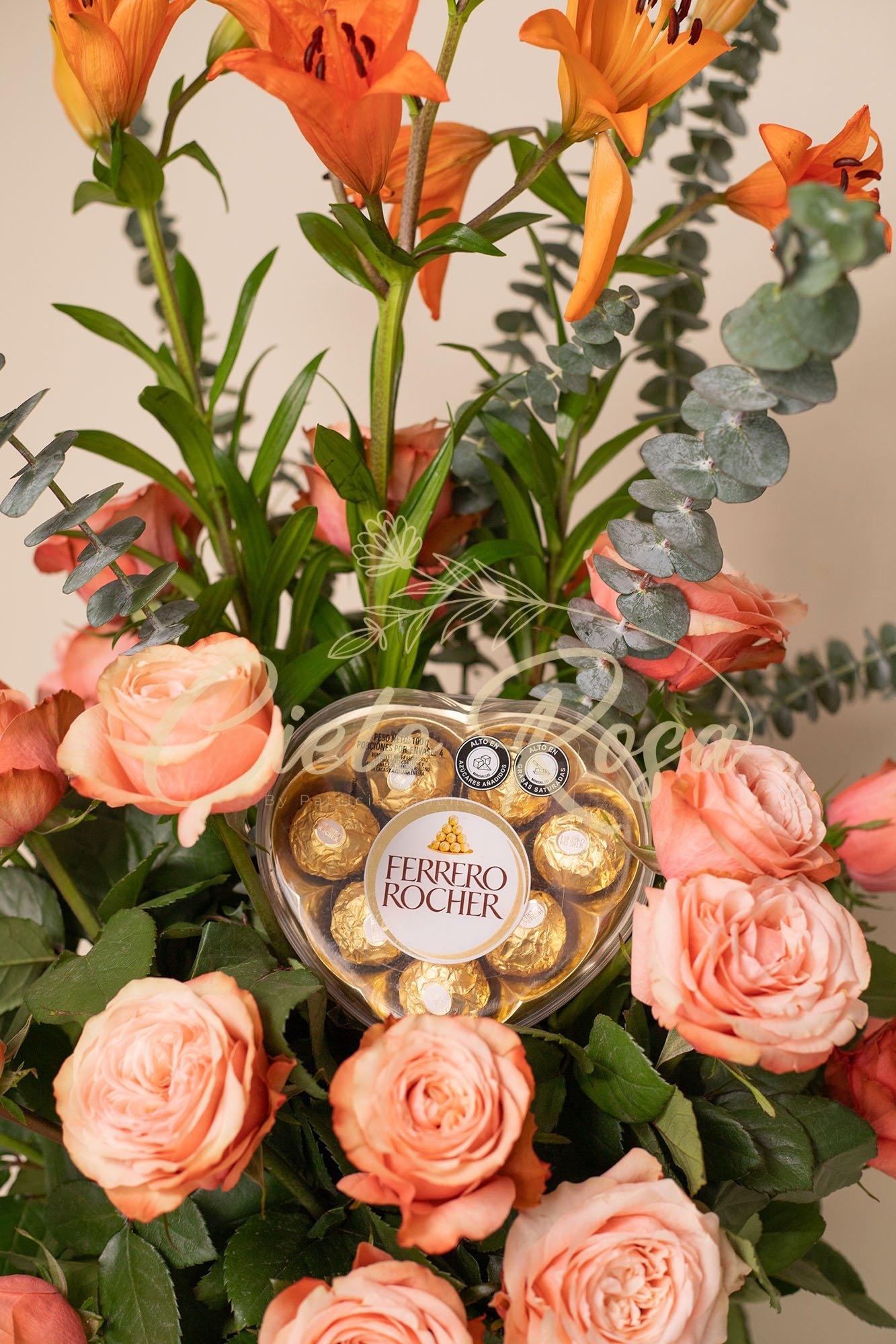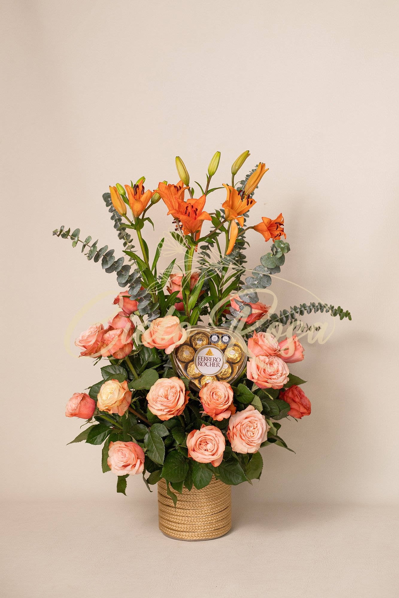 Rosas salmón con lirios, follaje surtido y chocolates