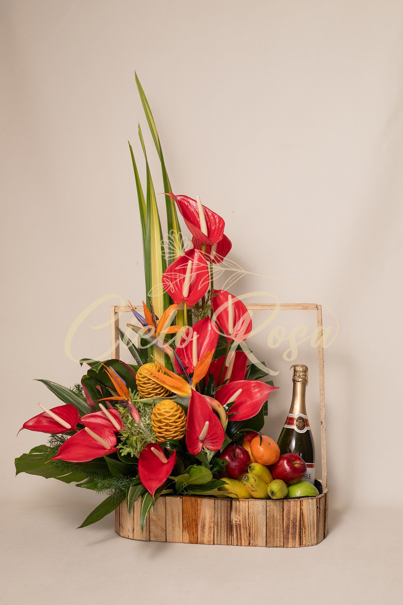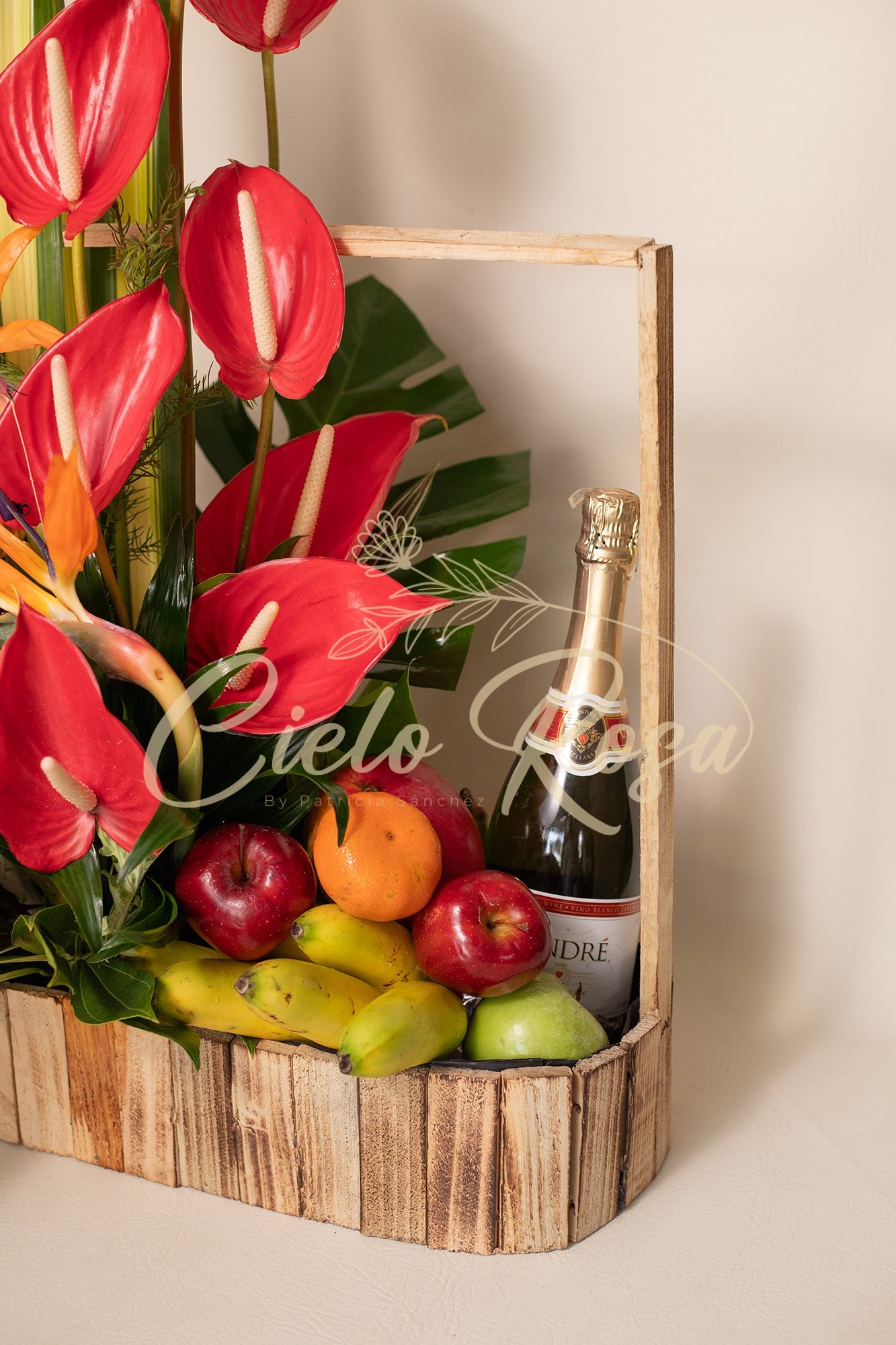 Canasta de madera con hortensias surtidas, lirios, rosas, gerbera, follajes surtido, frutas de temporada y champaña andre