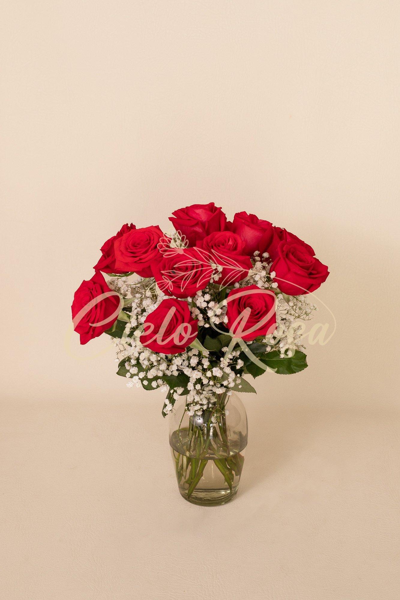 Jarrón vidrio con 24 Rosas rojas perlita o Gypsophilia