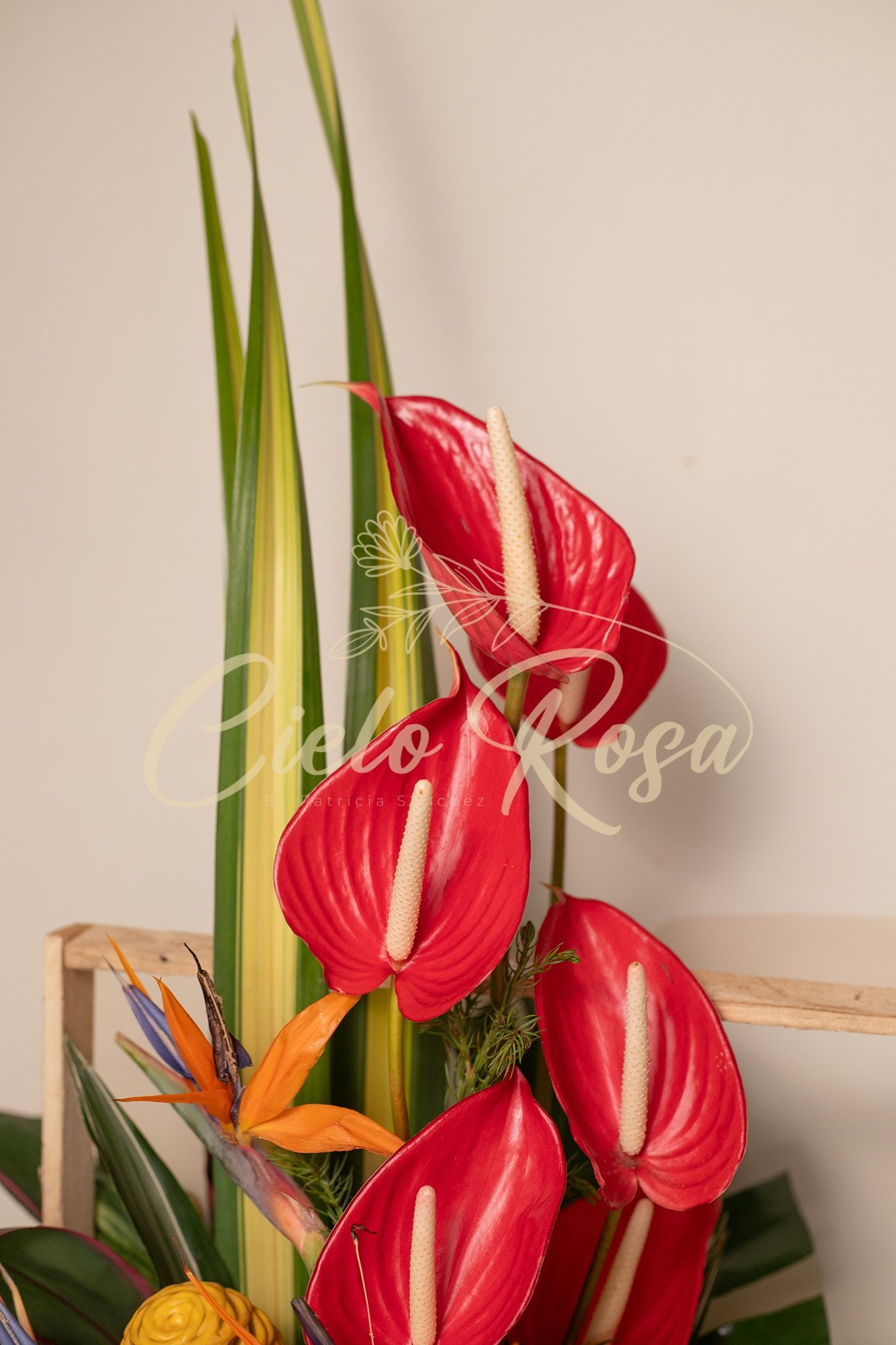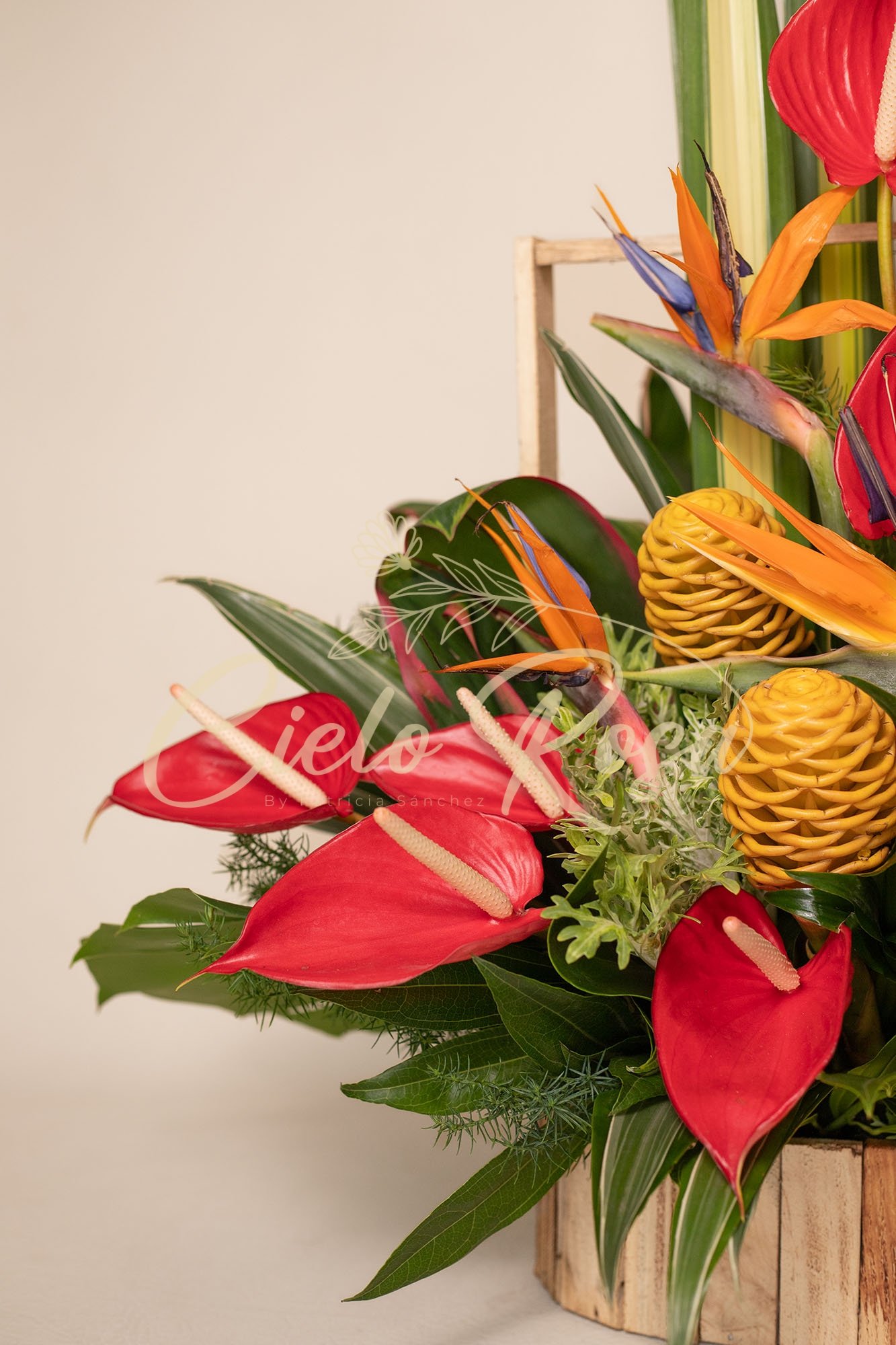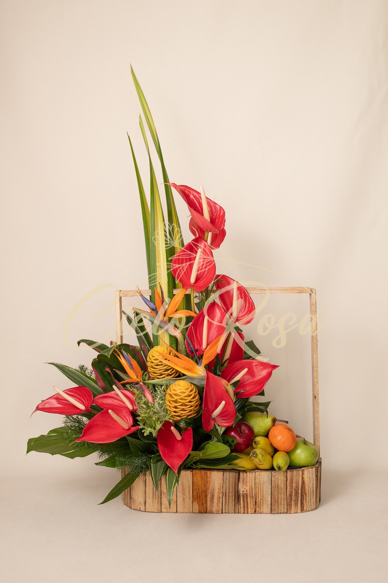 Canasta de madera con hortensias surtidas, lirios, rosas, gerbera, follajes surtido y frutas de temporada