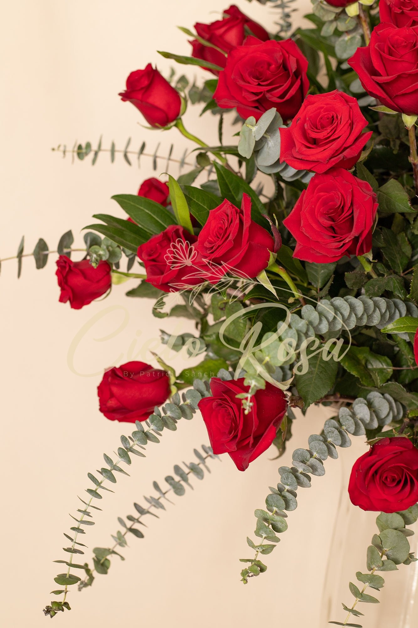 Caja de madera con 80 rosas, follaje y tarjeta personalizada